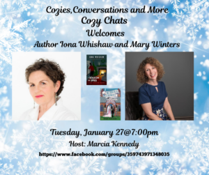 January 27, 2026, 7 pm ET: Join me and Iona for a bookish conversation at Cozies, Conversations, and More Facebook Group. See visual for link.